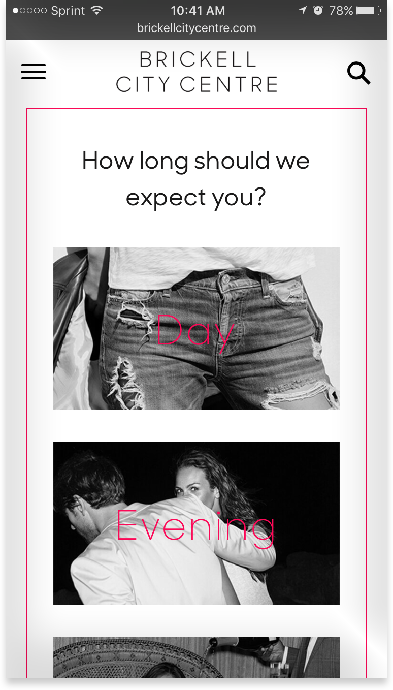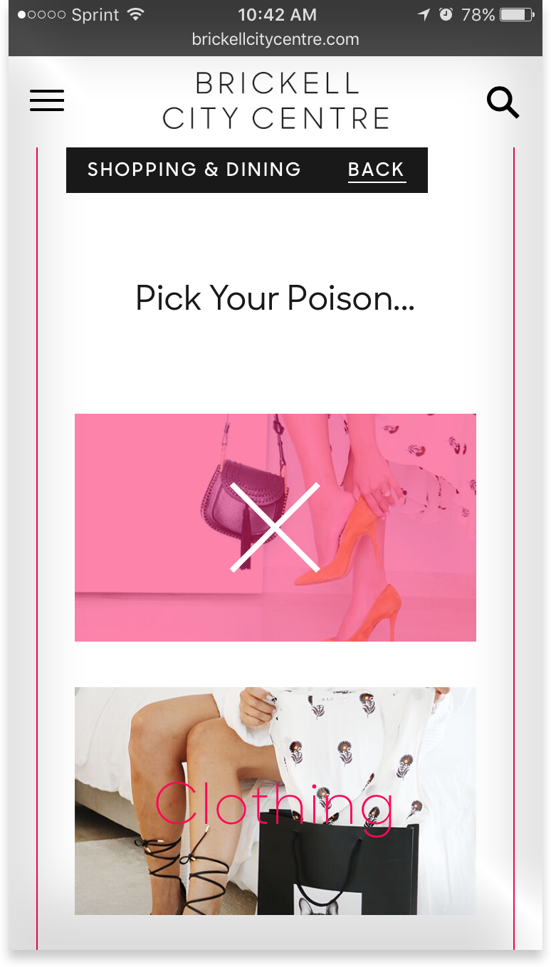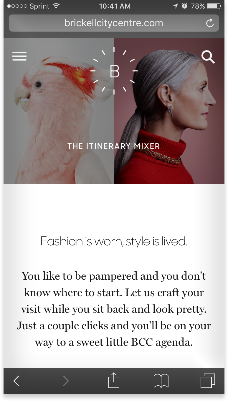 We endeavored to build a website that was unlike any other mall or shopping experience on the market today. Knowing that the first "visit" to Brickell City Centre for many visitors was going to come via an online channel, we saw the website as a key first impression that had to entice intrigue to drive foot traffic, as well as a utility for simple answers, all the while displaying the message in a beautiful format.